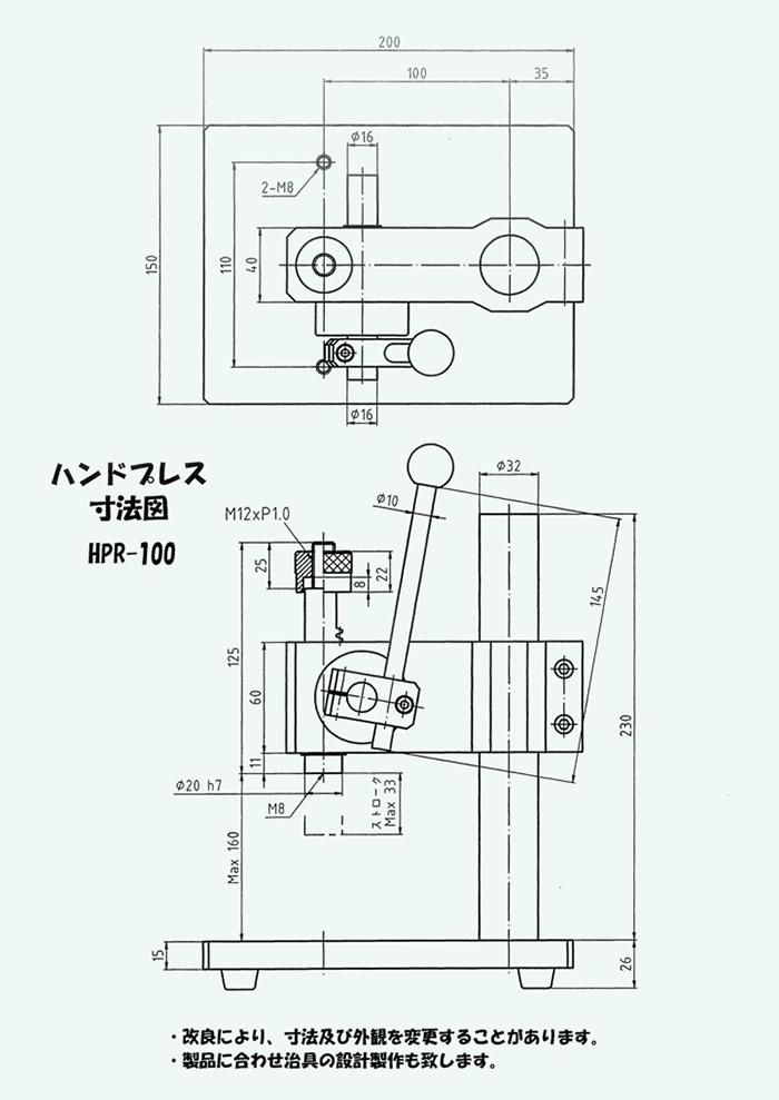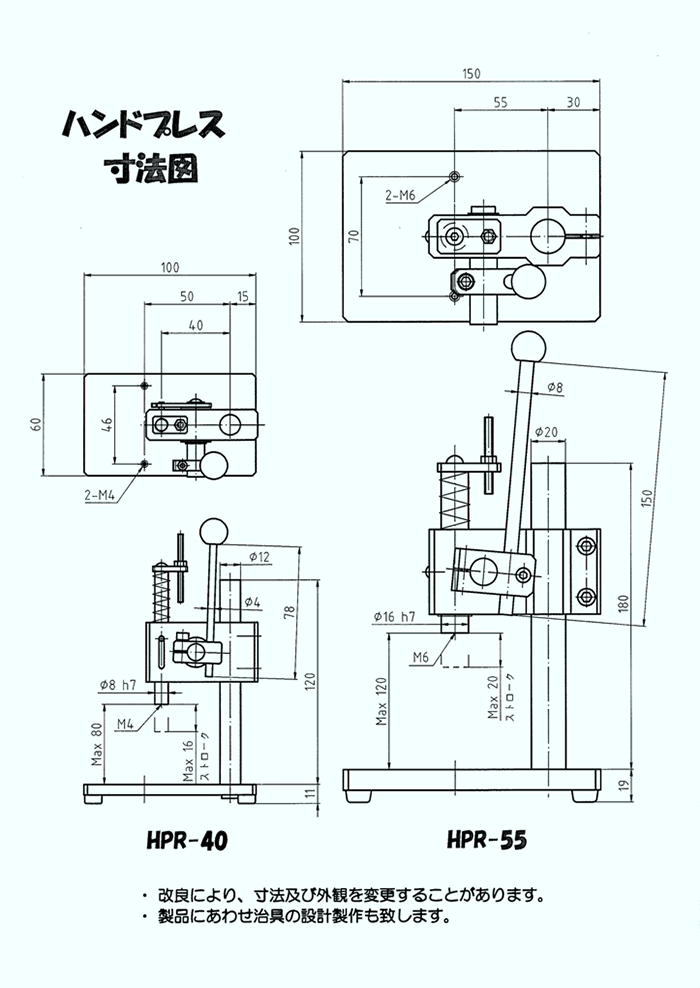 | 備考 | HPR-100にマグネットをつけることにより、 一定位置まで下げたときに保持する機能を持ったハンドプレスです。 全ての特徴、機能はHPR-100と同様です。 ※HPR-100MGをつけるとその分ストロークが短くなります。 |